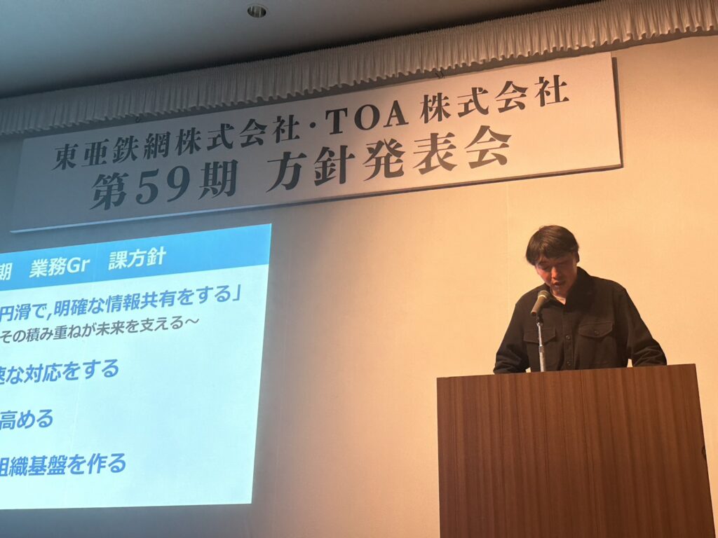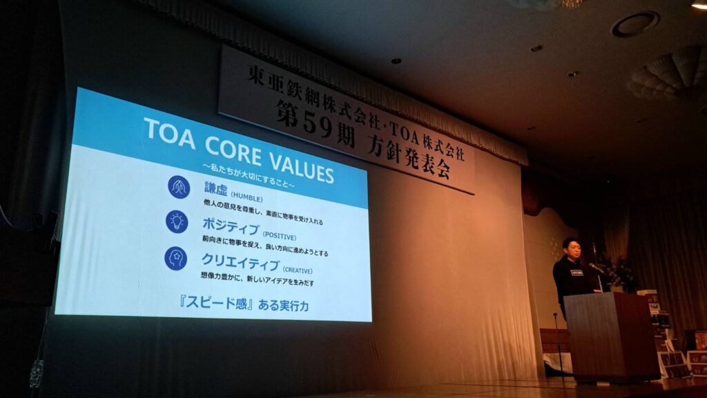 ~59期の目標と共有~ 第一部では、10月よりスタートした第59期の経営方針や、各部門ごとの取り組み方針、目標数値などを共有しました。 全社が同じ目標に向かって力を結集し、継続的な成長と価値提供が実現できるよう、社員一丸となる決意の場となりました。また、当社の経営理念「全従業員の幸せを追求し、地域社会の発展に貢献する」を土台に、価値観の共有を目的として新たに策定した「TOA CORE VALUES」についても発表いたしました。